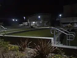 The two-story Y building is located on both upper and lower campus, with the offices portion on the first floor, in the lower campus, and the library located on the second floor in the upper campus.