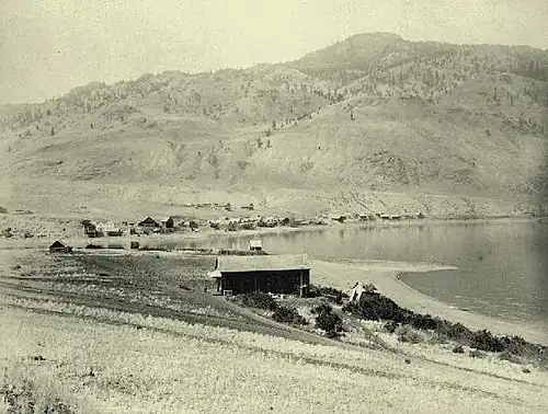 In 1870, James Uren purchased the W.H. Kay stopping house, which he refurbished and later extended.[50] In the early 1870s, James Sabiston operated a store.[51] Uren managed the HBC warehouse 1873–1878,[52] which held freight awaiting lake transport to Kamloops.[41] About 1882, he renamed the lodgings as Savona House.[52] John Jane's general store, which opened in 1881, soon faced competition from the various stores across the lake which sprang up to serve the CP construction crews.[53] Around this time, Abraham Thomas opened a saloon, which became known as the Central Hotel.[54] In fall 1883, James A. Newland and Adam B. Ferguson opened a hotel called Lakeview House,[55] which thrived during the CP construction period.[56] The location of the cemetery on the north shore suggests its existence by this time.