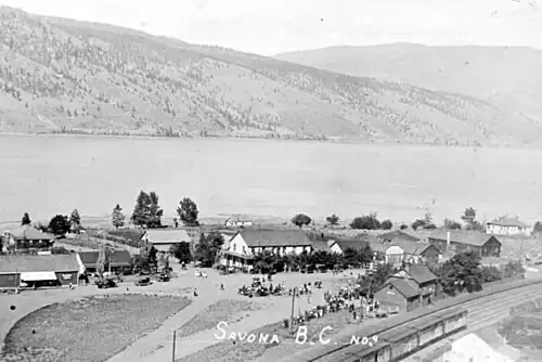 Savona (/səˈvnə/ sə-VOH-nə) is an unincorporated community in the Thompson Country region of south central British Columbia. The place is on the western end and south shore of Kamloops Lake, adjacent to the outlet into the Thompson River.[1] On BC Highway 1, the locality is by road about 38 kilometres (24 mi) east of Cache Creek and 45 kilometres (28 mi) west of Kamloops. The surrounding countryside is semi-arid grasslands and hills, which support cattle ranching.