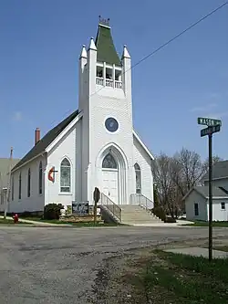 The 1883 United Methodist Church is built in rectangular plan and has a large spire on its front elevation. The building has a stone foundation and an attached parsonage. The windows are a Gothic style and feature stained glass. Scales Mound Holy Trinity Catholic Church has had two additions, the first altered the front facade c. 1915 and the second was a large rear addition in c. 1970. The building, a contributing property despite its alterations, is a gable-front design with a side tower. The church is of brick construction and has stained glass windows with curved window hoods. The First Presbyterian church is another example of a gable-front church in Scales Mound. It was built between 1875–90 and features an offset tower. Its foundation is of stone and rusticated block. It has Gothic style stained glass windows and was added onto the rear one time.[2]
