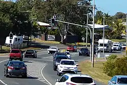 After proceeding south-east for about 350 metres it crosses Ross Creek and passes between Cooee Bay (to the east) and Taranganba (to the west) It then proceeds through Lammermoor, running beside the beach for about 1 km before reaching Rosslyn. Where it enters Rosslyn the road is cut into an ocean-front cliff-face near Statue Bay. This section of road was closed from 20 February 2015 until 26 July 2018 due to a landslip caused by Cyclone Marcia.[3] A temporary detour through suburban streets was in use throughout the closure.[4]