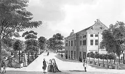During the Seven Years' War in 1760, while the queen retreated to the Magdeburg fortress, Russian troops pushed deep into Prussia, occupied Berlin and devastated Niederschönhausen Palace.[1] After 1763 it was rebuilt in its current form according to plans by Johann Boumann and the gardens were remodeled in a Rococo à la française style.