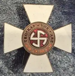 Enlisted men wore a cross painted in off-white color with golden outer edges. The cross has a medallion in the center, which is soldered to the cross. The medallion has the golden inscription Our Honour is Loyalty (Danish: Troskab er Vor Ære) and golden oak leaves below. In the inner ring is a white mobile swastika with an opaque red paint in the background.[1]