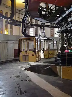 After the war it was eventually decided to build a suspended cable car line from a point close to the intended start point of the previously planned rack railway. The line was privately built and owned, opening on 17 July 1930 after three years of construction. It was built to Professor Benoit's design, using one carrying cable and two traction cables. There were 10 cabins, a maximum of 8 of which could be used at any time, and each cabin carried up to 22 passengers and a conductor.[6]
