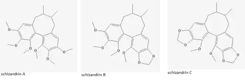 Schisandrins [1] (schizandrins) are a group of bioactive chemical compounds found in Schisandra rubriflora, Schisandra sphenanthera, and Schisandra chinensis.[2][3] Schizandrin is a lignan.[4]