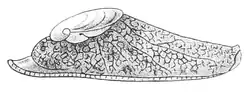 The length of specimen contracted in alcohol is 20 mm, the height and breadth are 9 mm. Behind the shell, which is situated upon the hinder half of the body, the tail projects slightly. The end of the tail is flat, has no caudal mucous pit, and is bluntly pointed. The margin of the foot is produced into a slight flange. A pair of grooves running along the median line from the mantle to the muzzle define a row of small tubercles. Right and left, between this median line and the foot-edge, 2 indistinct grooves can be traced from the mantle to the lips. Posterior to these, the surface is divided into tubercles by small irregular grooves meandering outwards and downwards. The mantle has an even margin, with 2 small lappets on the under-side; the right proceeds forward from a little behind the respiratory pore (pneumostome), extends to almost one-third of the length of the mantle-margin, and forms a narrow fold; the left is minute, simply a rudiment, and in some specimens it is difficult to detect. The sole of the foot is without a defined median area. Two small labial tentacles are present. The color is reddish-brown, splashed with black, and darkest above. The mantle and sole are ashy-yellow.[7]
