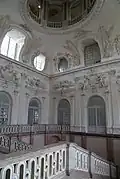 The interior is dominated by the large banqueting hall in the middle of the building. The frescoes were done by Johann Anton Gumpp, Francesco Rosa and Johann Andreas Trubillio.