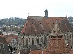 The Holy Cross Minster (Heilig-Kreuz-Münster) is the city's main Catholic church. It stands on the site of a former, much smaller romanesque church. It took about 500 years to be completed, though not consecutively. Initial construction began around 1325 under the leadership of an unknown master builder on what was left of the previous romanesque church, the towers of which were still standing. In 1497, the south tower fell onto the north tower, which knocked over the north tower after a bow connecting the two was removed and in 1515, all repair work was finished.