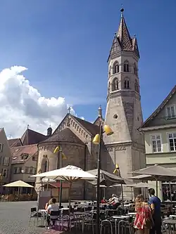 Sitting on the southeast of the Markt Square (only 78 meters northeast of the city hall), there lies a late Romanesque and neo-Romanesque church called the Johanneskirche, or Church of Saint John, also a Catholic church. As the story of its founding goes, Agnes of Hohenstaufen was out hunting in the Remstal one day and she lost her wedding band. She vowed to have a church built at the site where it would be recovered. Later, the ring was found in the antlers of a fallen stag at the site where the church now sits, and accordingly, Agnes commissioned the construction of the church. A cannonball fired during the Thirty Years' War (1618–1648) remains visibly lodged in the apse of the church.