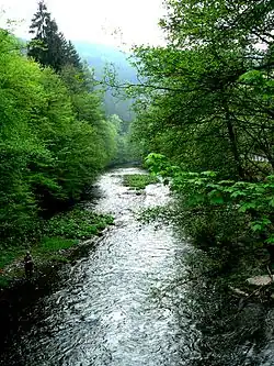 The Schwarza valley (German: Schwarzatal) parallels the axis of the Schwarzburg anticline (Schwarzburger Sattel), a structure that divides the Thuringian Forest to the northwest from the Thuringian Highland to the southeast.[1] The Schwarzburg Anticline was created by the collision between Laurentia and Gondwana around 350 million years ago.[2] The rock of the Schwarzburg Anticline is metamorphic, with a core of ordovician rock, largely quartzite. The river is geologically unusual for the large number of kolks in its lower course.