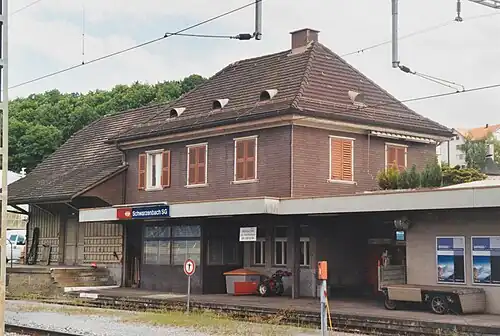 Schwarzenbach SG railway station (German: Bahnhof Schwarzenbach) was a railway station in Schwarzenbach in the municipality of Jonschwil in the canton of St. Gallen (SG), Switzerland. It was located on the St. Gallen–Winterthur railway line, between Wil and Algetshausen-Henau. The station was closed in 2013 with the introduction of the St. Gallen S-Bahn.[1][2] The station building opened in 1927.[3]