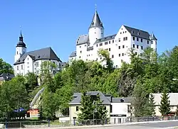 The Old Town with market square, castle and St.-Georgen-Kirche (main church) forms the town's historical core. The Vorstadt was originally a southward extension outside the (now vanished) town walls, originally formed around a mill. Late 19th century factories and workers' housing around the station became the Neustadt north of the Old Town, now housing the civic centre with town hall and employment centre. North-west and south-west of the Old Town, the Hofgarten and Heide low-rise residential areas were built in the 1960s and 1970s, respectively, using large-block construction (a precursor of plattenbau construction).[4] The plattenbau residential area Sonnenleithe at the town's northern border was built in the 1980s.