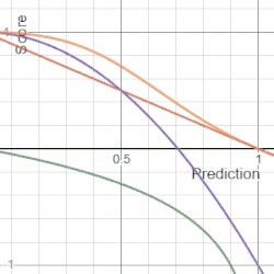 Shown below on the left is a graphical comparison of the Logarithmic, Quadratic, and Spherical scoring rules for a binary classification problem. The x-axis indicates the reported probability for the event that actually occurred.