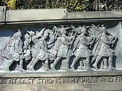 R. Tait McKenzie's Scots American War Memorial (1927), Edinburgh, Scotland has a line by Ewart Alan Mackintosh on the frieze at the back.