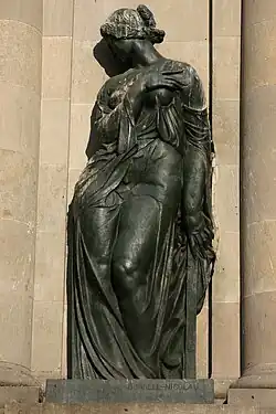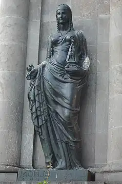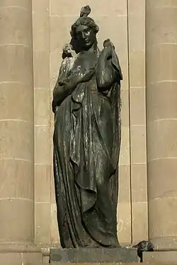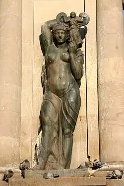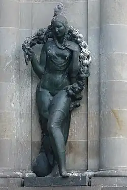 | Female figure | Josep Llimona | Bronze | 2,60 x 0,93 x 0,45 | It is on the same pillar as the previous one. It is a figure of a woman without special attributes, leaning on the right foot and with the left leg bent, in contrapposto position. She is dressed with tunic and mantle, which she holds with her arms, one on her shoulder and the other on one breast, while the other breast comes out of her clothes. At the base is the coat of arms of Barcelona. The foundry of this work was Esteban Barberí (Olot).[29] | |