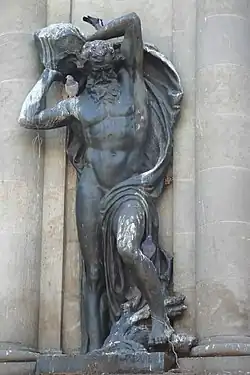 | Hercules | Antonio Parera | Bronze | 2,65 x 1,31 x 0,50 | It is located on the pilaster facing the sea, on the Besós side of the square. It represents the mythological hero Hercules, half-naked, with a cloak on his back, one of the folds of which covers his genitals. His arms are raised, holding a stone. The presence of this figure may allude to Jacinto Verdaguer's work La Atlántida, since according to the author, the demigod was the founder of Barcelona. In its lower part is the coat of arms of Gerona. It was cast by Gabriel Bechini (Barcelona).[30] | |