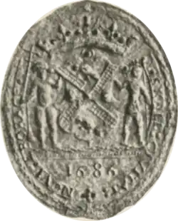 In 1683, the city's Common Council petitioned the colonial governor of New York for an official charter, including the right to designate their own seal. In 1686, the charter was granted. It included the right of the city to "breake Change Alter and new make their said Comon Seale when and as often as to them it shall seem convenient".[13] The city's Common Council then adopted a new seal on July 24, 1686, the first to be designed and approved by the city in its own right. The design contained many elements that survive in the current city seal—namely, a shield featuring windmill sails, beavers, and flour barrels, a colonial sailor and a Native American as supporters, a Latin legend, a founding date (in this case, 1686 was used), and a laurel wreath. The first known use of the 1686 seal reveals that the seal featured a ducal crown at the crest, a fact that has puzzled historians, since the city's owner and namesake, James II, had ascended to the throne of England in 1685, and thus the use of an imperial crown would have been warranted. Subsequent uses of the seal show that a change to an imperial crown was made, although the exact date of the change is unknown.[14]