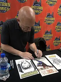 Writer Brian Michael Bendis signing a copy of the central miniseries at Midtown Comics in Manhattan.