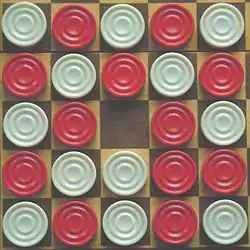 The game is played by two players, one with dark pieces and the other with clear pieces. Both start with the same number of pieces, equal to half the number of cells in the board minus one cell. Therefore, if the board has 25 cells, each player starts with 12 pieces. If the board has 49 cells, each player starts with 24 pieces. Some Seega boards have an X in the center cell.