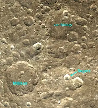 Segers is a small lunar impact crater that is located on the Moon's far side. It lies about one crater diameter to the east of the much larger crater Millikan. To the north of Segers is von Békésy.
