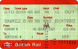 By this time, the "Day Returns Only" card could only be used to buy Cheap Day Returns, following the introduction of the "Cheap Day" fare to distinguish between peak-time and off-peak journeys. "Cheap Day Returns Only" wording began to appear on these Railcards accordingly; but they were withdrawn from 10 January 1988, with the price of the "full" Railcard being increased from £12.00 to £15.00 at the same time. The APTIS ticket issuing system had been introduced in late 1986, and was still in the process of being rolled out across the British Rail network in 1988, so the APTIS "Cheap Day Returns Only" Railcard (form number BR 4599/18) is rarely seen. The first APTIS version of the full Railcard (BR 4599/17), with mauve upper and lower bands,B also lasted until 10 January 1988,[7] at which point the following changes were made: security background (miniature repeats of the words "British Rail") was changed from the light green colour seen on most APTIS ticket stock to a dark pink; the upper and lower bands became dark brown; and part of the background was filled with the words "Senior Citizen Railcard" in cursive writing in white. This style lasted only until October 1988, at which point the white lettering changed to brown.[7][8]