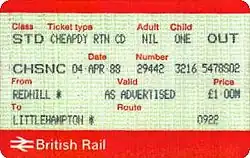 • Off-peak "Go anywhere" flat-fare tickets in the "London & South East" area (the predecessor of Network SouthEast) in November 1983; four accompanying children travelled for £1.00, as could one dog. Fridays were excluded.