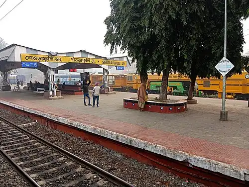 The broad-gauge Sheoraphuli–Tarakeswar branch line was opened by the Tarkessur Railway Company on 1 January 1885 and was worked by East Indian Railway Company.[6][7] Testing of electric locomotives with some coaches on section Belur to Konnagar commenced on 10 November 1957. On four suburban trains, hauled by electric locomotives, introduced on the section Howrah to Sheoraphuli from 1 December 1957, a saving of 11 minutes per run compared to steam services was achieved.[8]