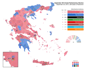 Parliamentary elections were held in Greece on Sunday, 20 September 2015, following Prime Minister Alexis Tsipras' announced resignation on 20 August.[1] At stake were all 300 seats in the Hellenic Parliament. This was a snap election, the sixth since 2007, since new elections were not due until February 2019.[2]