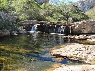 The climate is tropical, with average annual temperature of 28 °C (82 °F).[1] The park protects part of the Espinhaço Complex ecosystem, which is threatened by agriculture.[1] The park's vegetation is mainly rupestrian fields, with some native trees such as Jataipeba, Aroeira and Sucupira. There are some areas of closed forest.[2] Vegetation includes cerrado, rocky meadows and dry forest.[1]