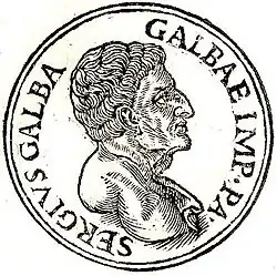 Servius Galba then had a dispute with Caesar over a debt, also felt his friendship with Caesar cost him the consular election in 49 BC.[2] In 45 BC, Galba complained that the Senators were not given their proper respect.[3] According to Suetonius, Caesar had an affair with Galba's wife Postumia, which caused more anger.[4]