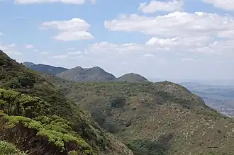 The Sete Passagens State Park is in the municipality of Miguel Calmon, Bahia, with an estimated area of 2,821 hectares (6,970 acres).[1] It is in the Chapada Norte region of the state, 367 kilometres (228 mi) from Salvador, the state capital.[2] It is in the Itapicuru River basin. It is an important source of water in a drought-prone area, with numerous springs that supply streams to contribute to the Itapicuru-Mirim River, a major tributary of the Itapicuru. The park covers the Campo Limpo, Sapucaia and Jaqueira ranges to the south of the Jacobina range.[1] The park contains dozens of greens hills cut by valleys. The highest point has an altitude of 1,270 metres (4,170 ft).[2] There are prehistoric rock paintings in a small grotto at the top of the mountain.[2]