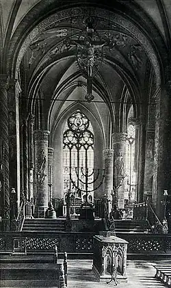 The chancel of the Minster church in 1904, recognizable by the candelabrum in the chancel and the Altfrid tomb in the foreground