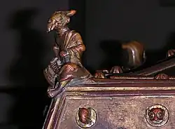 The seven-branched candelabrum in Essen Cathedral corresponds to the Jewish menorah and derives from the same Old Testament in the second book of Moses (Exodus 37:17-24). In early Christianity, the "seven" symbolized the unity of the divine and the earthly, as it united the "three" of the Trinity and the "four" of the earthly cardinal points. At the same time, the number seven stood for the seven gifts of the Holy Spirit, while the lampstand stood for Christ himself.[5] The candelabrum symbolizes at the same time the light of the world, which shines in all four directions of the wind represented by the bronze figures of the foot, in order to bring all people home to Christ at the end of all days. This reference to the final judgment over all people and the resurrection from the dead allows for the interpretation that Abbess Mathilde had it made as her memorial lampstand.[5]