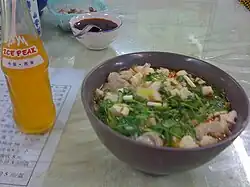Vermicelli in lamb's blood soup 粉湯羊血 粉汤羊血 fěn tāng yáng xué A soup composed of ingredients such as congealed lamb's blood, paomo and other condiments. It is eaten with vermicelli and cilantro.