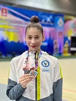 In 2023, she competed at the Asian Championships in Manila, where she won gold in teams with the other Uzbekistani gymnasts. The group won silver in the all-around and with 3 ribbon & 2 balls.[9][10] At the World Championships in Valencia, Uzbekistan was 10th in teams. The group ended 15th in the all-around.[11]