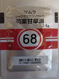 During the medieval and early modern periods, Chinese herbal medicine was introduced to Japan and adapted into what became known as Kampo medicine—a system of traditional Japanese herbal therapy.[4] Shakuyaku-kanzo-to was one of many classical Chinese formulas incorporated into the Kampo system.[1][5] In the 20th century, shakuyaku-kanzo-to became one of the standardized formulas approved for clinical use in Japan under the modern Kampo framework. Kampo formulas, including shakuyaku-kanzo-to, are regulated by the Ministry of Health, Labour and Welfare and are widely prescribed in both traditional and conventional medical settings.[1] It is included among the 148 Kampo extract formulas approved for prescription by the government and is covered under the National Health Insurance Drug Tariff.[5] In Japan, it is manufactured under standardized preparations such as Tsumura No. 68.[2] It was also reported that shakuyaku-kanzo-to has usage on Korea, where it is called jakyakgamcho-tang.[5]