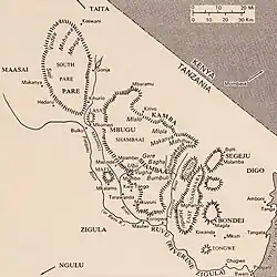 The WaSambaa were ruled by the Kilindi dynasty from the mid-18th century to the end of the 19th century. The founder of the dynasty was Mbegha, who was from Ngulu and his son Bughe established the hilltop capital at Vuga in the Usambaras.[17] The kingdom reached its greatest extent under Kimweri ye Nyumbai. After he died in 1862 a civil war broke out over the succession, fueled by competition for the new wealth that the caravan trade in the Pangani valley had brought to the region.[18]
