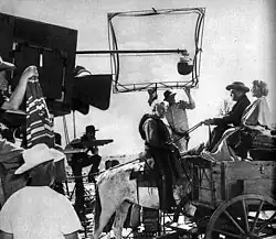 Alan Ladd disliked and was uncomfortable with guns; Shane's shooting demonstration for Joey required 116 takes.[18] A careful review of Shane's gun-skill demonstration to Joey shows Alan Ladd firing with his eyes closed. Later, in the saloon battle, Ladd's pistol is pointed well away from the man he shoots, especially the final scene—where he kills Ryker's brother. Jack Palance was nervous around horses, and had great difficulty with mounting and dismounting. After very many attempts, he finally executed a flawless dismount, which Stevens then used for all of the Wilson character's dismounts and—run in reverse—his mounts as well. Palance looked so awkward on horseback that Stevens was forced to replace Wilson's introductory ride into town astride his galloping horse with Palance riding at walking pace.[19] Stevens later noted that the change actually made Wilson's entrance more dramatic and menacing.[20]