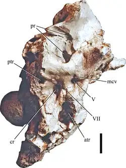 The material referred to Shaochilong, IVPP V.2885.1-7, was found in the Miaogou Formation (Maortu locality; originally interpreted as the nearby Ulansuhai Formation).[1] It consists of skull fragments (a braincase, partial skull roof, quadrates, and a right maxilla), axis and six caudal vertebrae. A fragmentary left maxilla was also referred to the species, although it has apparently gone missing as of 2009. Although these are believed to belong to a single individual, a lectotype was established in 2010 to accommodate for the possibility that the specimens came from multiple individuals. The lectotype consists of the braincase (IVPP V.2885.1) and partial skull roof (IVPP V.2885.2).[2] All of these specimens were discovered in Inner Mongolia and described by Hu in 1964 as a species of Chilantaisaurus.[3] The genus was informally named "Alashansaurus" by Chure in 2000.