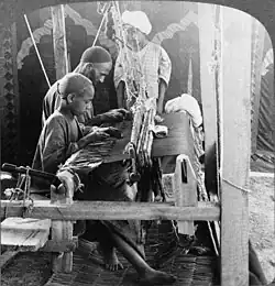 "The shawls made in Kashmir occupy a pre-eminent place among textile products; and it is to them and to their imitations from Western looms that specific importance attaches. The Kashmir shawl is characterized by the elaboration of its design, in which the "cone" pattern is a prominent feature, and by the glowing harmony, brilliance, depth, and enduring qualities of its colours. The basis of these excellences is found in the very fine, soft, short, flossy under-wool, called pashm or pashmina, found on the shawl-goat, a variety of Capra hircus inhabiting the elevated regions of Tibet. There are several varieties of pashm, but the finest is a strict monopoly of the maharaja of Kashmir. Inferior pashm and Kerman wool — a fine soft Persian sheep's wool — are used for shawl weaving at Amritsar and other places in the Punjab, where colonies of Kashmiri weavers are established. Of shawls, apart from shape and pattern, there are only two principal classes: (1) loom-woven shawls called tiliwalla, tilikar or kani kar — sometimes woven in one piece, but more often in small segments which are sewn together with such precision that the sewing is quite imperceptible; and (2) embroidered shawls — amlikar — in which over a ground of plain pashmina is worked by needle a minute and elaborate pattern." from Encyclopaedia Britannica, 1911[11]