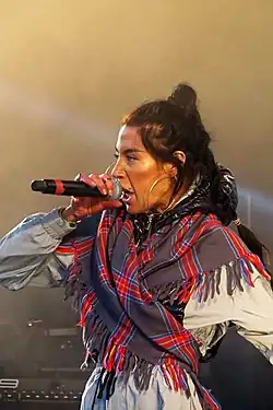 Maxida Märak wearing a traditional Saami wool shawl onstage at Riddu Riđđu 2019