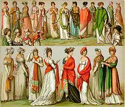 Kashmiri shawls were high-fashion garments in Western Europe in the early- to mid-19th century. Shawls in the Indian style were manufactured in the city of Norwich, Norfolk from the late 18th century. The "Norwich shawl" was produced by hand weavers using silk and worsted and supplied the high end of the market.[7][8] Paisley shawls, imitation Kashmiri shawls woven in Paisley, Renfrewshire, are the origin of the name of the traditional paisley pattern. Decline in market for expensive shawls, due to changes in fashion and the mass market competition from industrial production led to the ending of Norwich shawl making in the 1870s.[7]
