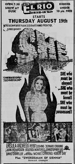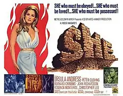 She is a 1965 British fantasy adventure film made by Hammer Film Productions in CinemaScope, based on the 1887 novel by H. Rider Haggard.[4] It was directed by Robert Day and stars Ursula Andress, Peter Cushing, Bernard Cribbins, John Richardson, Rosenda Monteros, and Christopher Lee. The film was an international success and led to a 1968 sequel, The Vengeance of She, with Olinka Berova in the title role.