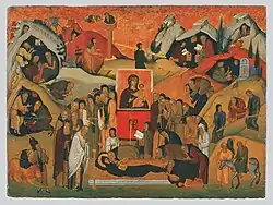Incense is offered by the priest or a bishop (if present) into a censor which is swung by either a priest or deacon.[16] When incense is offered inside of the church, the veil is opened and the altar, icons, relics, church and people are censed. Incense is offered during the Promion, Etro, Gospel and Quqlions.[17][18] The practice of offering burnt incense comes from the Bible; in Exodus where God instructs Moses to build an altar and burn incense there.[19]