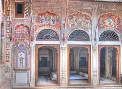 The great merchant era of patronage began around 1830 when Shekhawati merchants, settled in Calcutta and elsewhere, began to pour money back to their hometowns, much of which was turned to conspicuous building.[2] By then, under British protection, they were no longer shy of drawing attention to their wealth. The most obvious blossoming of wall-paintings in Shekhawati is on late 19th and early 20th century havelis. They aimed to construct five buildings: a haveli, a temple, a memorial chhatri, a well and a caravansarai.[3] Most were painted. The havelis offer the most variable subject matter, but temples, memorial chhatris and cupolas decorating wells are often richly decorated.