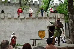 As of 2024, the event features 170 artisans and 150 daily live shows, including a falconry demonstration, improv troupes, belly dancers, and musicians.[9][10] Many of the Sherwood Forest Faire's shows and attractions are inspired by Robin Hood.[1][11][12] For example, the Sherwood Forest Players perform theatrical skits throughout the day featuring characters such as Robin Hood, Maid Marian, and the Sheriff of Nottingham. These performances are connected to an overarching storyline that changes each year.[13]