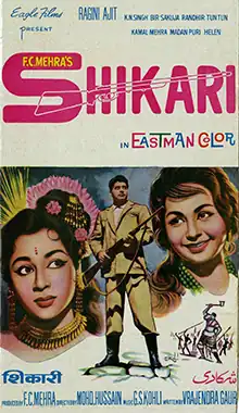 Shikari (transl. Hunter) is a 1963 Indian Hindi-language film directed by Mohammed Hussain. It stars Ajit, Ragini, Helen, Madan Puri, K. N. Singh and others.[1] The music of the film was the biggest asset of this film, and the songs "O, Tumko Piya, Dil Diya", "Mangi Hain Duaayen", "Ye Rangeen Mehfil" and "Agar Main Poochhoon", were catchy tunes that became popular on the music chart of the year. The film was loosely based on Hollywood films Dr. Cyclops and King Kong.[2]