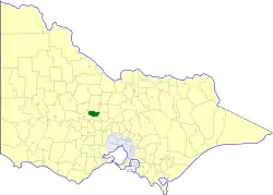 The Shire of Maldon was a local government area about 140 kilometres (87 mi) northwest of Melbourne, the state capital of Victoria, Australia, and 35 kilometres (22 mi) southwest of the regional city of Bendigo. The shire covered an area of 549 square kilometres (212.0 sq mi), and existed from 1858 until 1995.