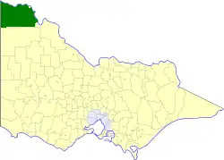 The Shire of Mildura was a local government area located at the northwestern corner of Victoria, Australia, on the Murray River and the South Australian border. The shire covered an area of 10,145 square kilometres (3,917.0 sq mi), and existed from 1890 until 1995. From 1920 onwards, Mildura itself was managed by a separate entity, ultimately known as the City of Mildura.