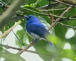 EBird describes the bird as "A fairly small bird of lowland and foothill forest understory. Male has deep-blue upperparts, head, and chest and a white belly. Told from Black-naped Monarch by its black mark between the eye and bill and from Celestial Monarch by its shorter, bushy crest. Female is told from other monarchs by its gray-blue upperparts. Song is a series of clear piping notes, increasing in volume. Also gives a 2- to 3-note call of sharp rasping notes with the first note higher-pitched."[3] It is often seen in mixed species flocks along with other birds such as Blue-headed fantail, Rufous paradise flycatcher, Sulphur-billed nuthatch and other small forest birds.